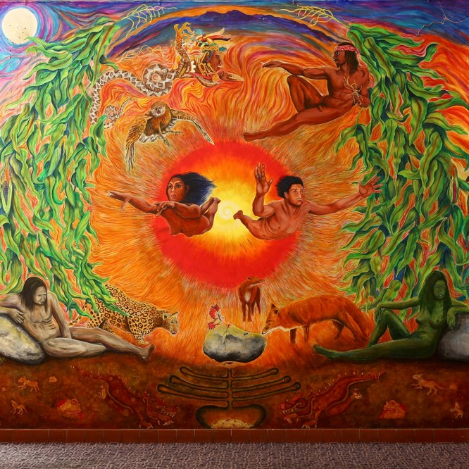 This 15’ x 12’ mural was conceived and planned in 1985 for the Casa Zapata Dining Hall. The Mythology of Maíz forms the first part of a mural that continues on two adjoining walls with the history of maíz.