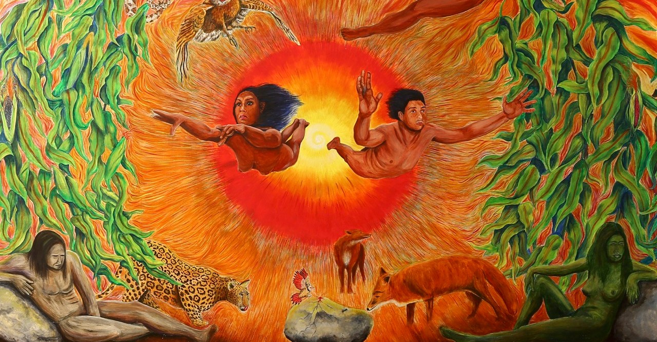 “Hundreds of myths surround maíz. They range from North American Indian mythology to Aztec and Mayan mythology. The few myths in this mural have a central emphasis on the Mayas. Taken from the Popol Vuh, the following are short versions: